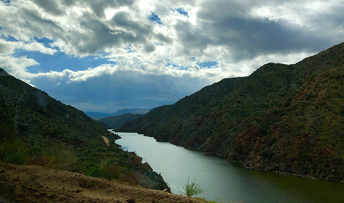A short while later we reached a high dam at the entrance to the Apache Trail. This is a dirt road, mainly following the edge of a deep Canyon with a river deep below. Dramatic mountains surrounded us as we drove several miles along the Apache trail. There'd just been unusually heavy rainfall, so parts of the track had fallen into the depths and one of the old bridges had virtually transformed into an aqueduct! What breathtaking scenery... We could feel the heartbeat of that wild remote place from every tree and rock, and we made it as far as the beautiful and mysterious Apache Lake, before eventually having to turn back due to a spot where the road had totally crumbled away...